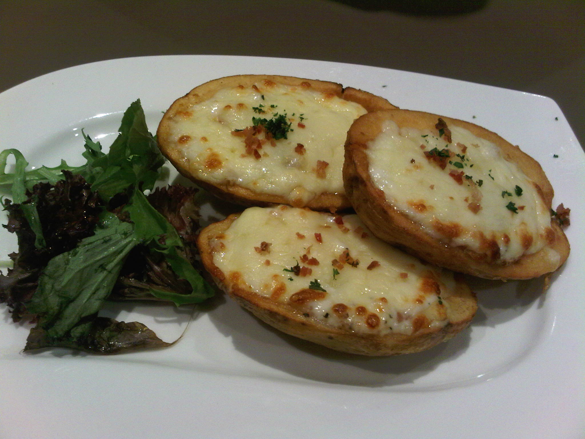 Skin on potatoes, topped with something like chicken mayo salad and ham as fillings then melted with mozzarella cheese in the oven.