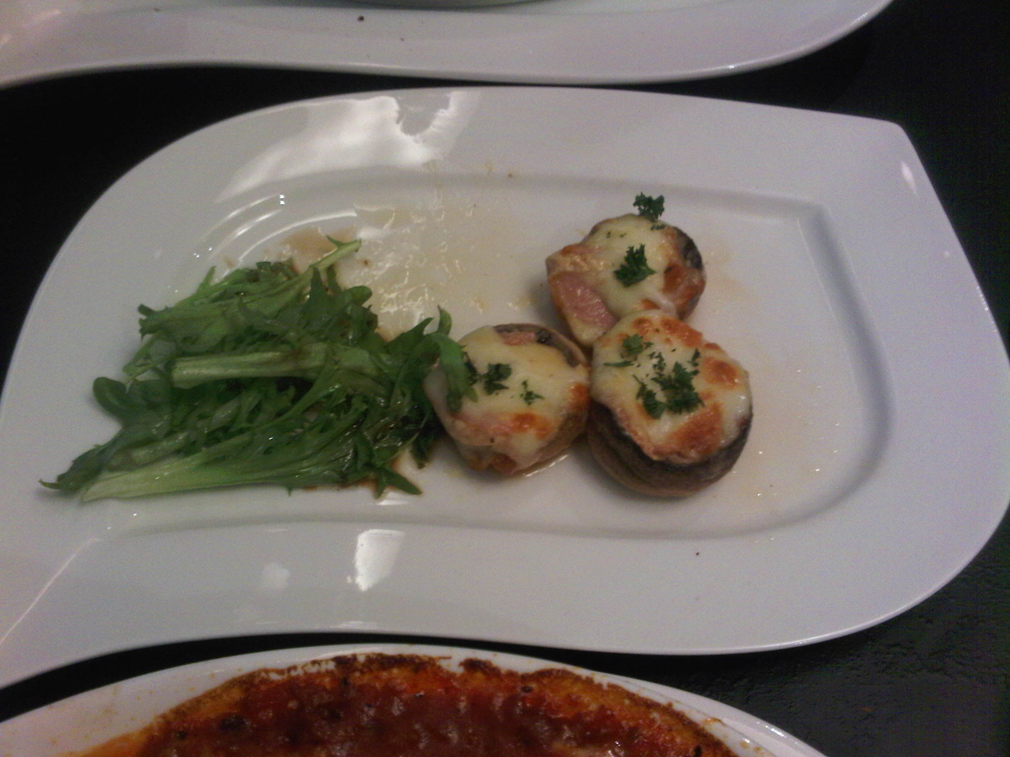 Button Mushrooms [Not those small canned yellow button mushrooms] topped with cheese and ham, grilled to perfection. It's still so juicy and flavorful! Just great. Oh, we were hungry again so we already helped ourselves to one each before taking the picture.