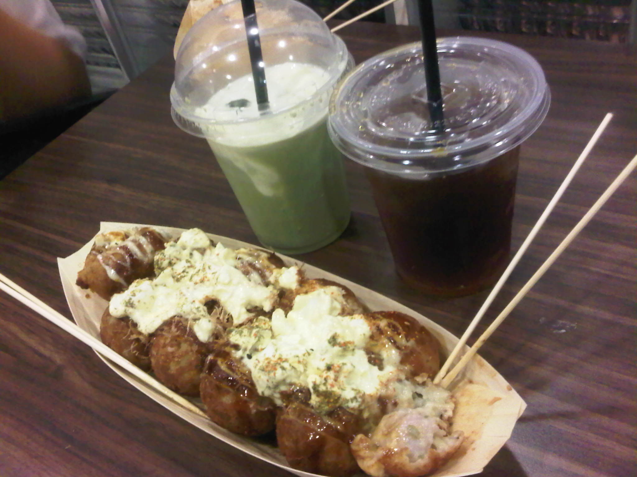 Actually, on its left, they also serve Taiyaki [たい焼き, literally baked sea bream], fish shaped waffles traditionally stuffed with sweetened azuki bean (red beans) or custard, chocolate or cheese. And on its right they also have Yakisoba [焼きそば, japanese stir fried noodles] . Though the takoyaki's gains the highest popularity and longest queues, I would love to try them out too another day. The green drink by the way is Matcha [抹茶, Japanese milled green tea] with an ice cream float, and it comes as a set by topping an additional dollar.
